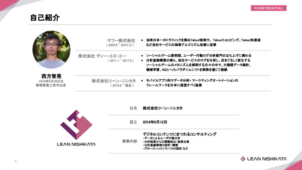 2018年、分析×マーケティングを活かしたモバイルアプリへのグロースハックフレームワークを日本に浸透させるべく株式会社リーン・ニシカタを創業。