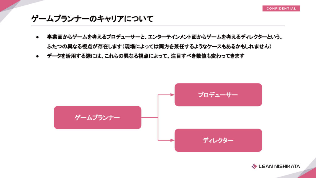 事業面からゲームを考えるプロデューサーと、エンターテインメント面からゲームを考えるディレクターという、ふたつの異なる視点が存在する(現場によっては両方を兼任するようなケースもある)