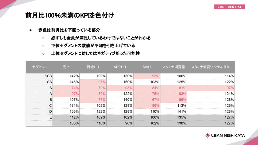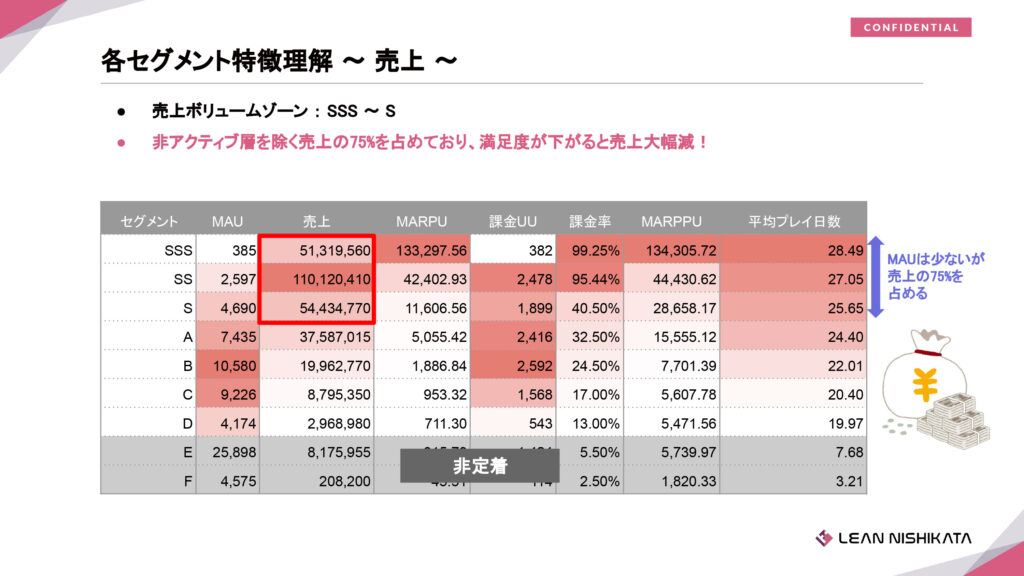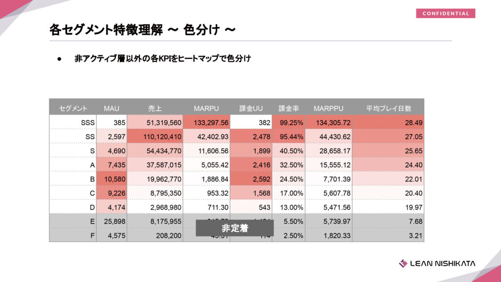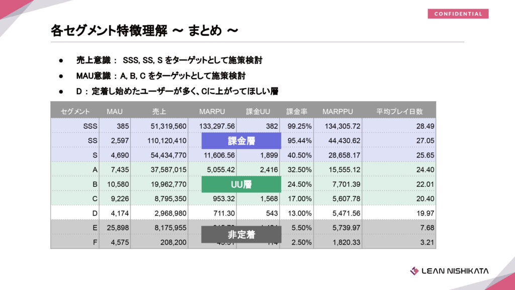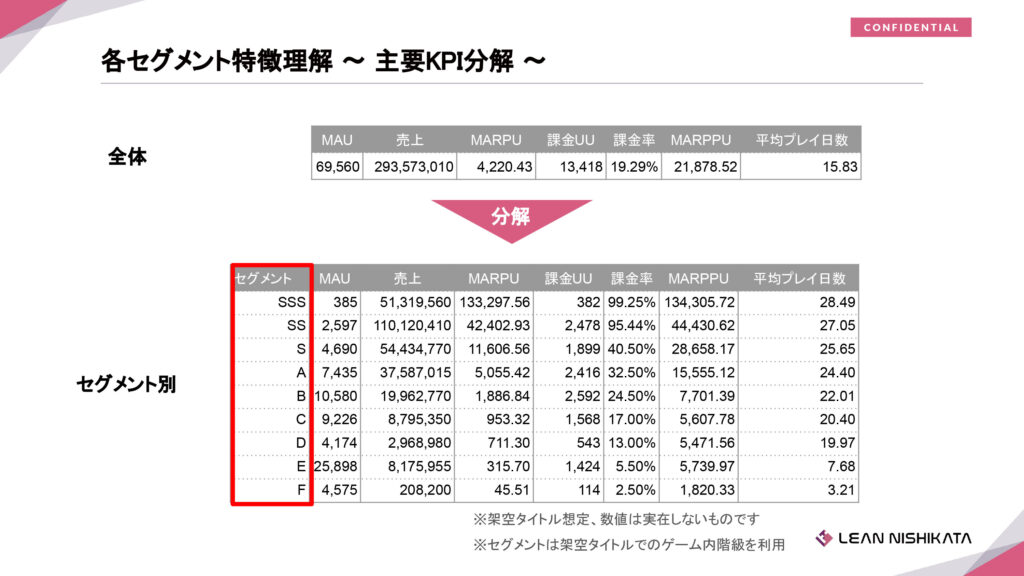 分かるように、セグメントとして、ユーザーをSSS~Fまでのランクを作りゲーム内で彼らがどう行動しているかを見る