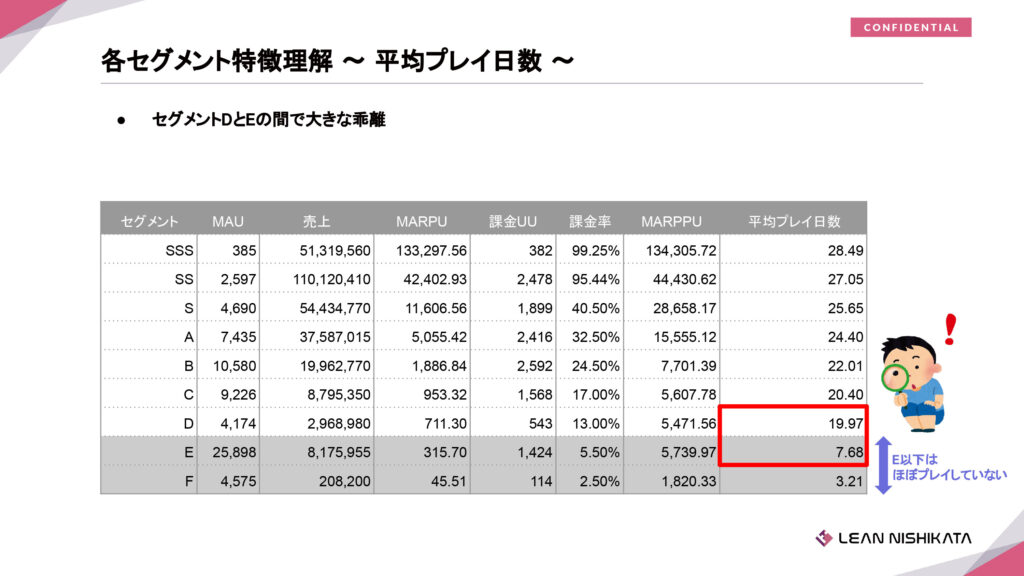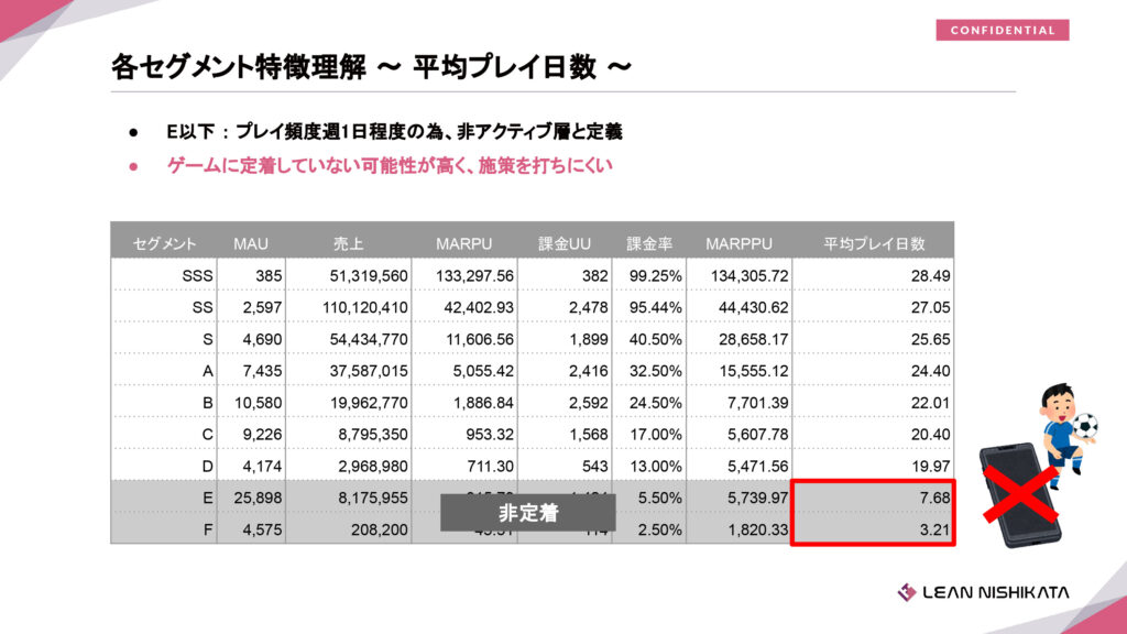 よって、セグメントEとFについては、運営の想定の遊び方が出来ていないので、今回は非定着UUとして設定。
