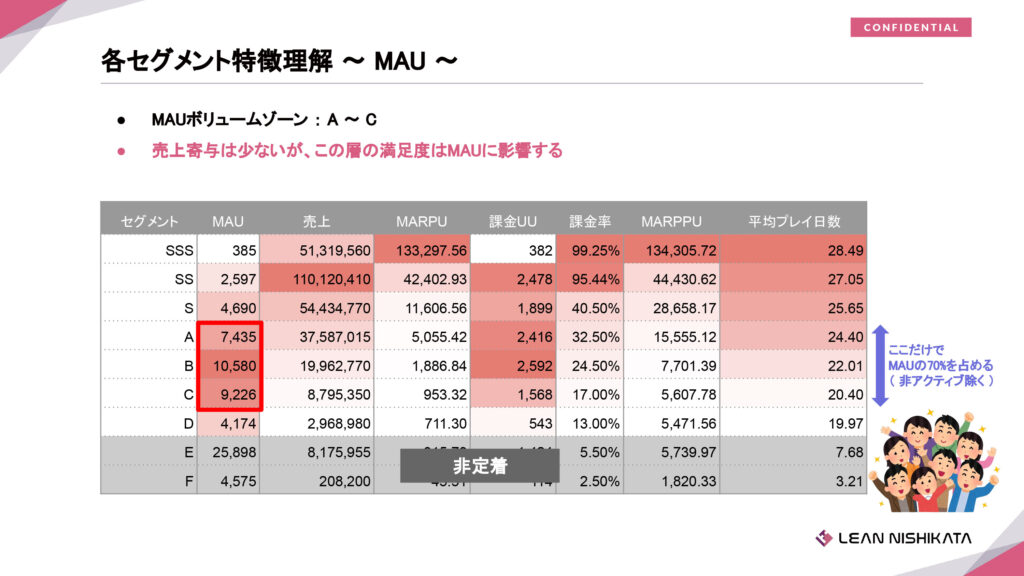 ゲームのユーザー数を支えているのは、セグメントのA、B、Cになる。