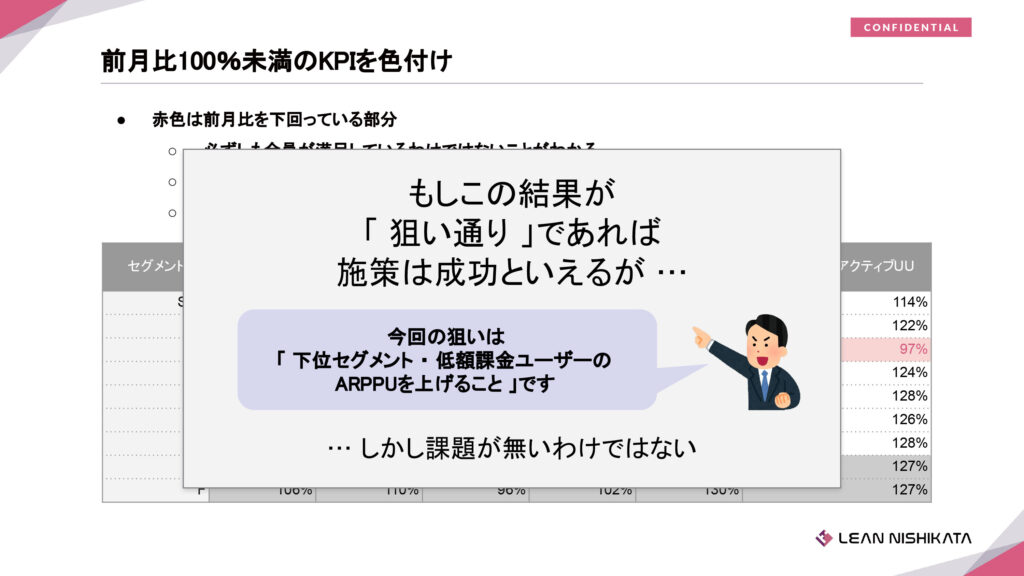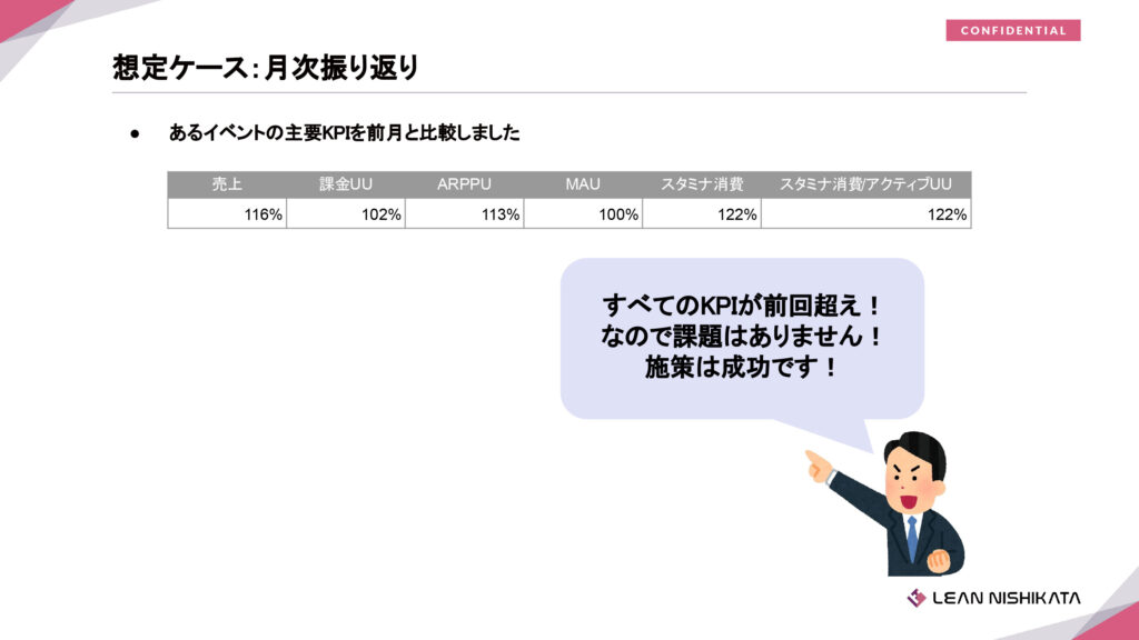 課金UUを先月と比較して今月は良かった。いずれの結果が100%超えていると評価しがちだが、